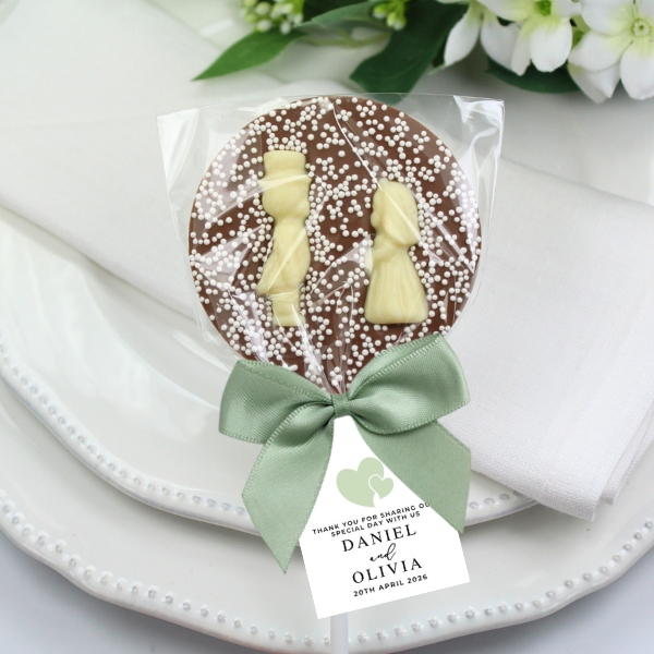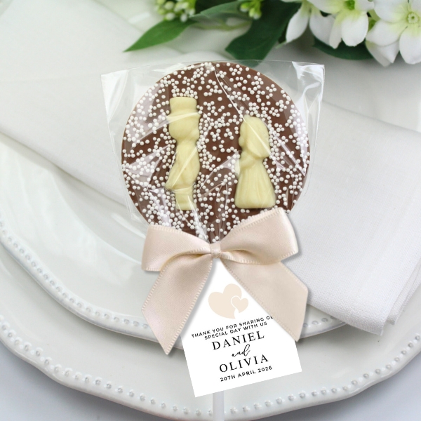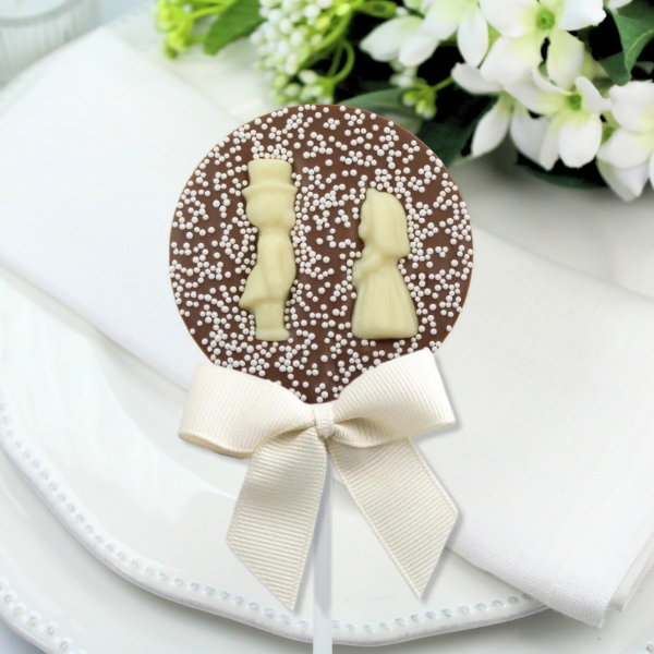 Crafted with the finest Belgian chocolate these beautiful lollipops feature a charming design of a bride and groom and sprinkles, making them a delightful addition to any wedding theme, that your guests will love. These favours not only serve as a delicious treat but also as a decorative element, adding an elegant and whimsical touch to your reception tables. Whether you choose to display them in a decorative basket or use them table favours, these bride and groom chocolate lollipops are sure to be a hit with your guests.