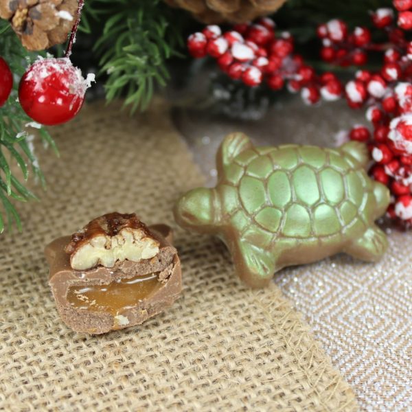 Belgian milk chocolate filled with creamy caramel in the shape of a turtle sitting on top of a caramelised Pecan, simply divine!