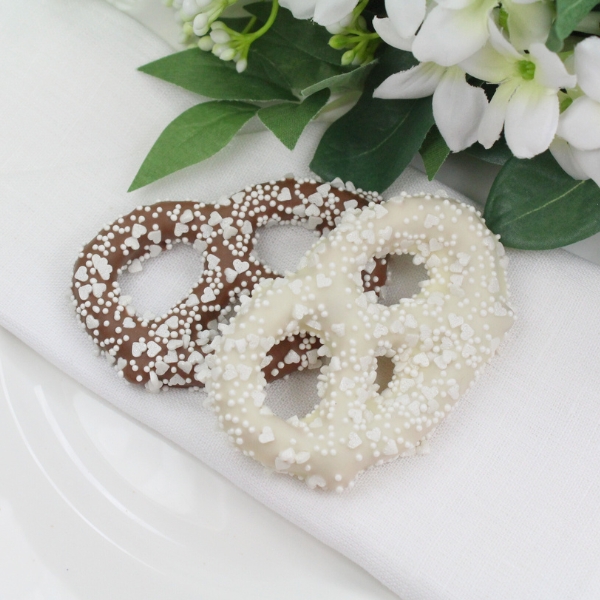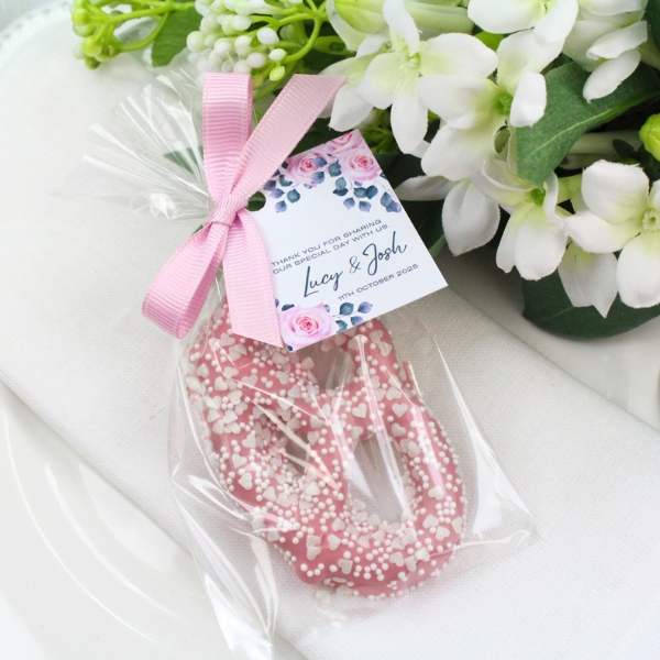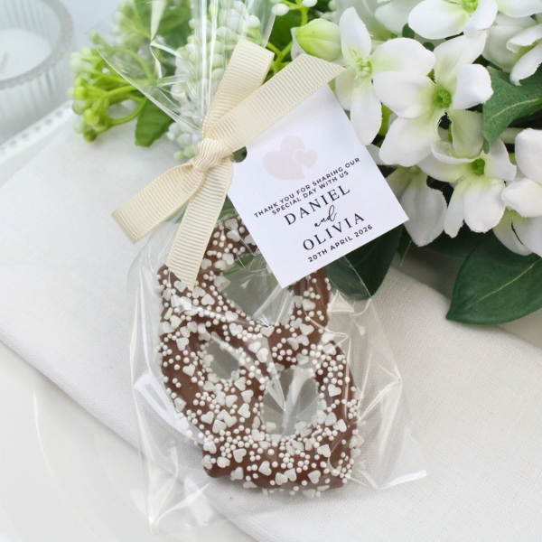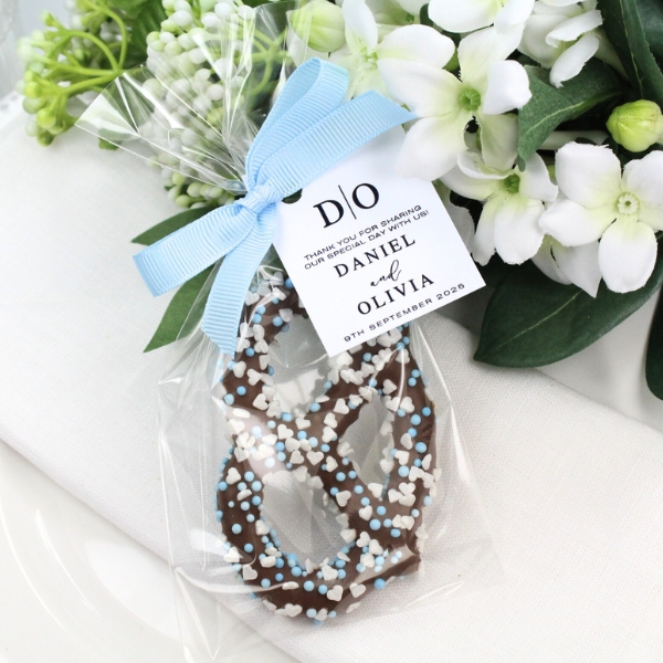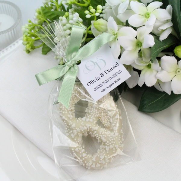 Each pretzel is packaged in an individual bag, tied and decorated in the colours of your choice making them a delicious and stylish favour option for your wedding. Whether you choose milk, white, dark, pink strawberry chocolate, or a combination of all, these chocolate covered pretzels are sure to be a crowd-pleaser and a memorable addition to your special day.