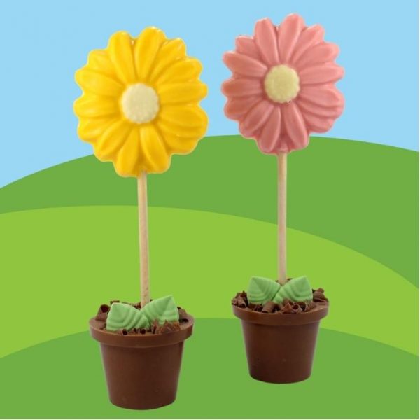 Solid Milk Chocolate Pot with Strawberry or Lemon flavoured Flower, all edible apart from the wooden Stick.