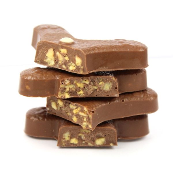 Milk chocolate bar filled with crunchy honeycomb and topped with an iced bee motif and honeycomb effect chocolate pieces.