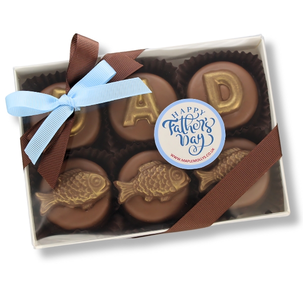 Your Oreos will come wrapped in a gift box, tied with bows and personalised with a Happy Father’s Day sticker, we can also supply a Happy Birthday sticker or none at all, please leave the sticker required in the box provided. Our boxes are fully bespoke, if you would like to have all fish instead of dad please ask.