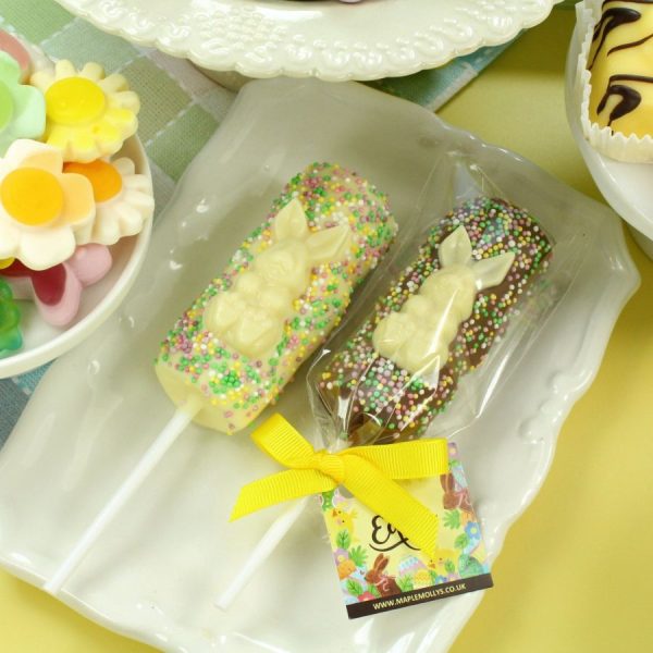 Three large marshmallows are dipped in either, Milk, White, Dark or Strawberry Pink Chocolate, topped with an Easter Chocolate Motifs and Sugar Sprinkles.