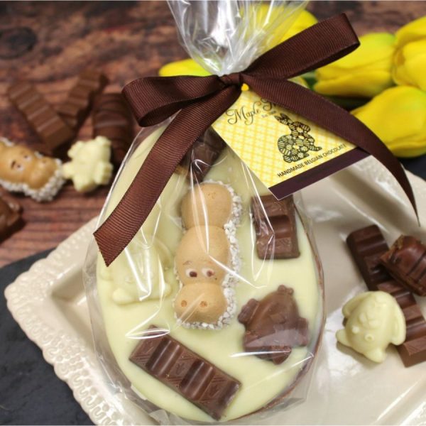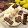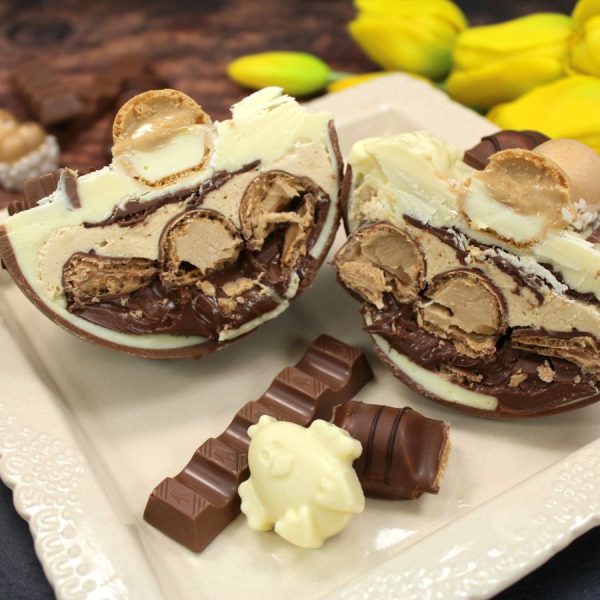 Easter Kinder stuffed egg. Milk and white chocolate shell, filled with hazelnut milk and white chocolate ganache, a crunchy Kinder Bueno, and topped with white chocolate, Kinder Hippo, Kinder Small bars, and milk and white Belgian chocolate Easter motifs.