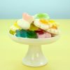Sugar, Cocoa Butter, Whole Milk Powder, Cocoa Mass, Cocoa Butter, Emulsifier SOY Lecithin (E322), Natural Vanilla, Glucose Syrup, Water, Pork & Beef Gelatine, Acids (Lactic, Malic, Citric), Maltodextrin, Flavourings, Fruit & Vegetable Concentrates (Apple, Spirulina, Black Carrot, Safflower, Grape) Vegetable Oil (Coconut, Palm Kernel ), Glazing Agent (Carnauba Wax), Gelling Agent (Pectin), Humectant (Sorbitols), Modified Potato Starch, Colours, (Curcumin, Paprika Extract, Cochineal, Beta-Carotene).