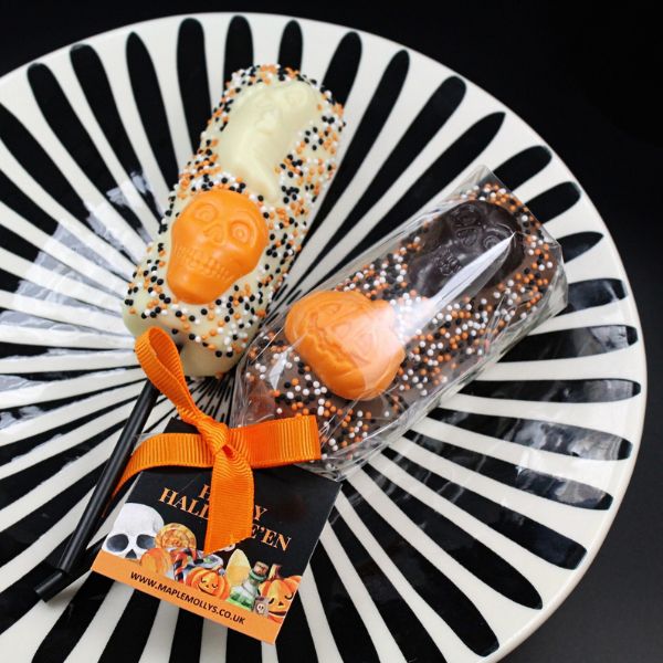 Three large mallows coated in creamy milk or white chocolate and decorated with Halloween chocolate motifs and sugar sprinkles. Please choose your chocolate below, if no chocolate is chosen a milk chocolate mallow will be supplied.