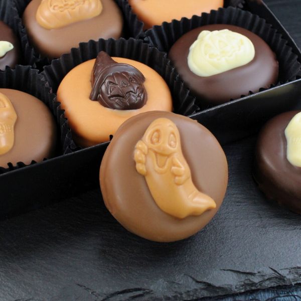 Oreo cookies are dipped in Milk, White and Orange flavoured chocolate and are topped with spooky motifs.