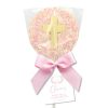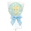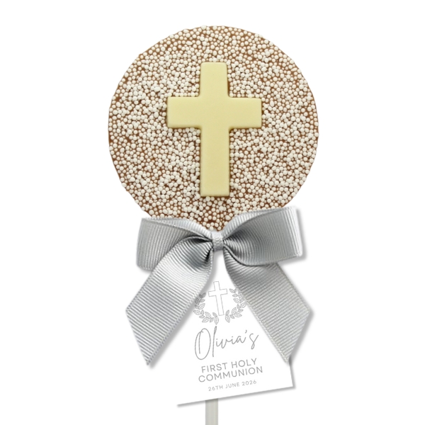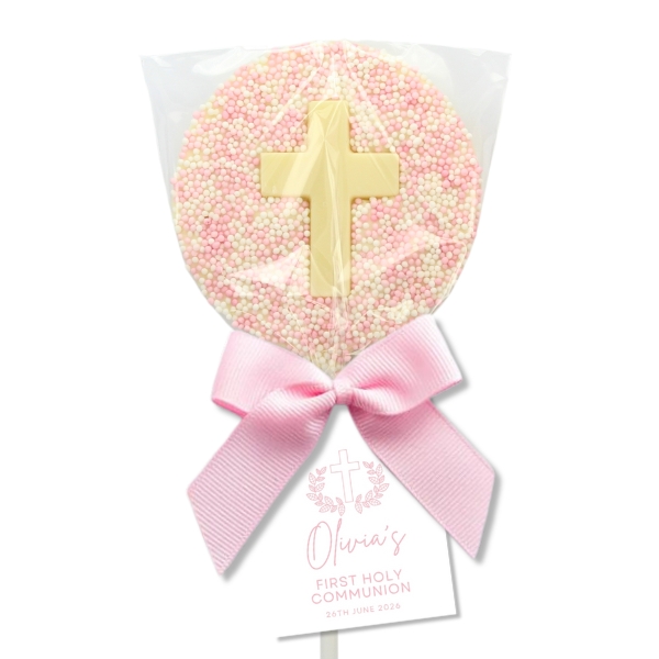 Round Belgian chocolate lollipops topped with a white chocolate cross, sprinkled and tied with the colours of your choice.