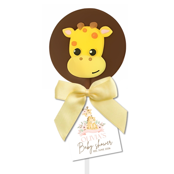 Jungle animal chocolate lollipops, perfect for a jungle animal themed birthday, baby shower or event. A thick solid base in your choice of chocolate is topped with an iced jungle themed animal and personalised to match your theme.