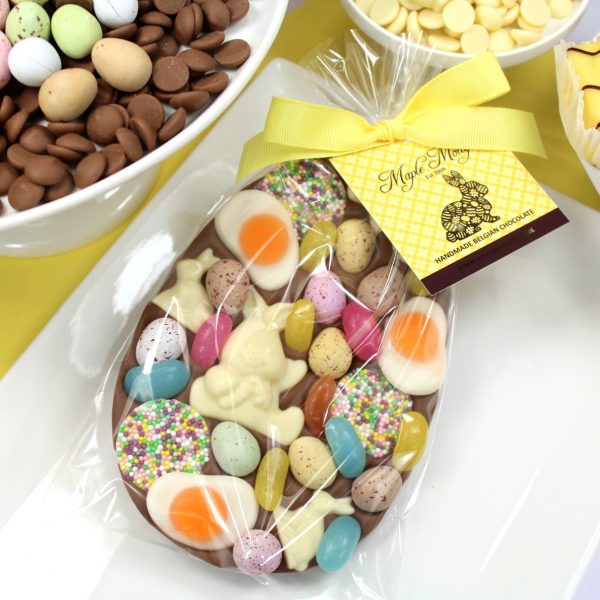 Milk chocolate egg-shaped bar with Easter Jellies, Easter Jazzies, Chocolate Shapes, Mini Eggs and Jelly Beans – fully loaded!