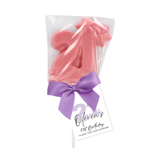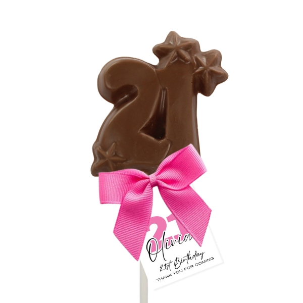 Our personalised number 21 chocolate lollipops are a sweet and unique way to add a touch of sweetness to your celebration, making them a delightful treat for guests of all ages.