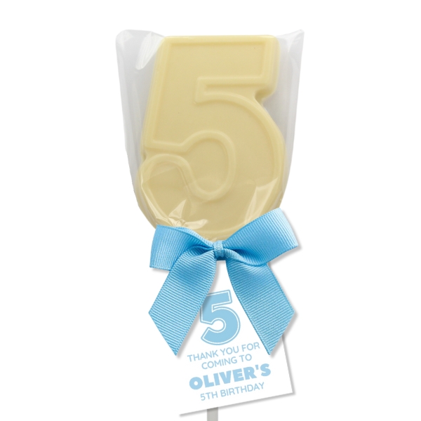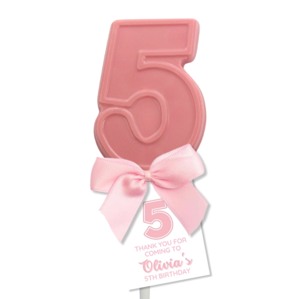 Each chocolate lollipop measures 18cm from top to bottom of the stick and the chocolate number measures 8.5L x 5 W x 1D cm – Net WT: 46g
