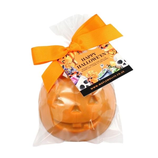 Solid orange flavoured milk chocolate pumpkin bar, coated in an orange chocolate shell.