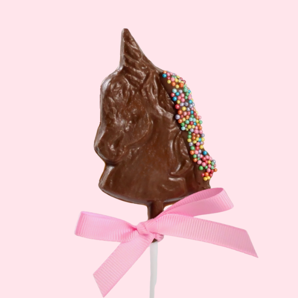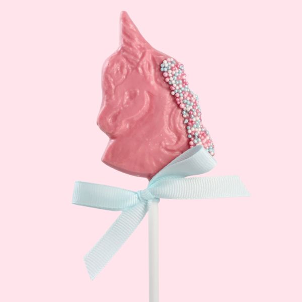 These delightful lollipops feature a unicorn head with a sprinkled mane, making them a whimsical addition to any party or event. Each Unicorn chocolate lollipop comes with a personalised label, making them perfect party favors for guests of all ages.